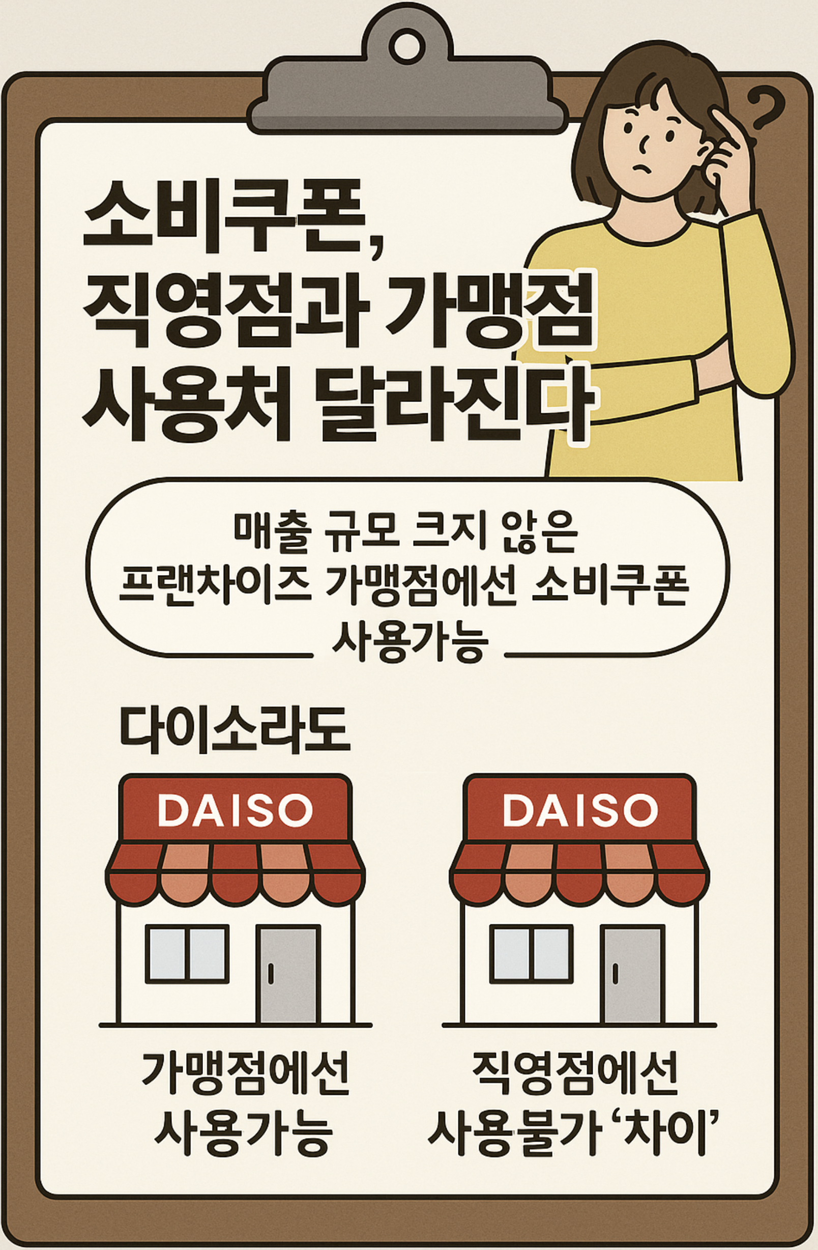 같은 브랜드인데 왜 안 돼요? 직영점 vs 가맹점 차이, 알고 계셨쥬?갑자기 길 가다 메가커피 간판을 봤는데“어? 소비쿠폰 써야지~!” 하고 신나게 들어갔거든요?근데... "여긴 직영점이라 안 돼요" 라는 말 듣고 멘붕 와버렸슴다ㅠㅠ어이없고 당황스러운 순간, 나만 그런 줄 알았는데 알고 보니 다들 그런 경험 있더라구요 ㅋㅋ소비쿠폰 사용처가 한정적이라는 건 알고 있었지만진짜 문제는 “직영이냐 가맹이냐” 이 미묘한 차이였어요!같은 다이소인데도 되고 안 되는 거? 네이거 다 그 차이 때문이쥬.소비쿠폰 신청은 했는데“어디서 써야 하냐고요?”오늘 글은 바로 그 궁금증 해결해드릴라고 가져왔심다!읽고 나면 쿠폰 써서 헛걸음할 일 없으실 거예요~🙌1. 소비쿠폰, 뭔데 이렇게 복잡해졌쥬? 🌀이번에 정부에서 대대적으로..