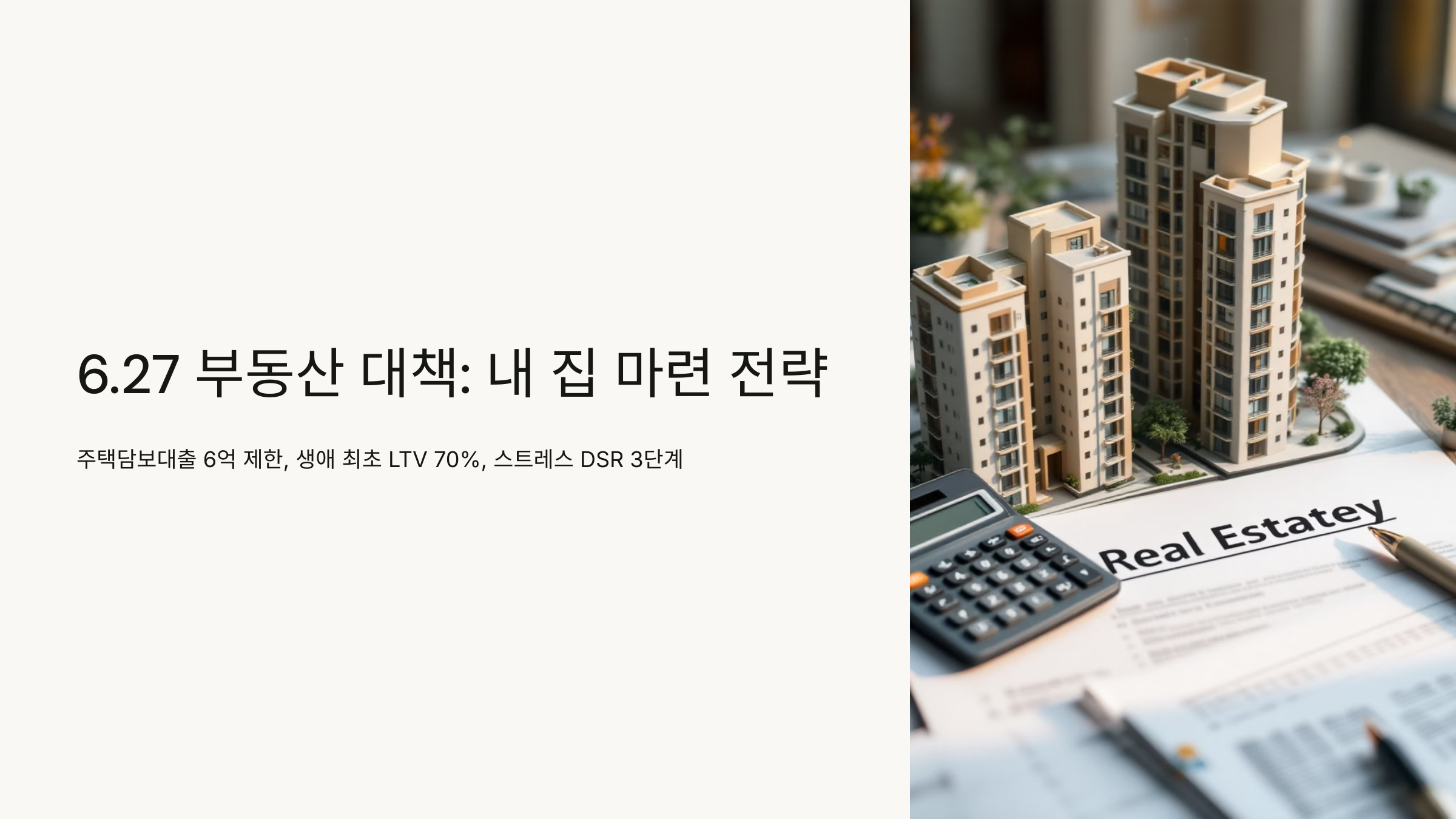 최근 발표된 6.27 부동산 대책은 많은 사람들에게 충격을 안겼습니다. 주택담보대출 6억 제한, 생애 최초 LTV 한도 축소, 그리고 7월 1일부터 시행되는 스트레스 DSR 3단계까지. 이러한 변화는 어떻게 내 집 마련 계획에 영향을 미칠까요? 이번 포스팅에서는 새로운 부동산 정책의 핵심과 그에 따른 전략을 소개합니다.
