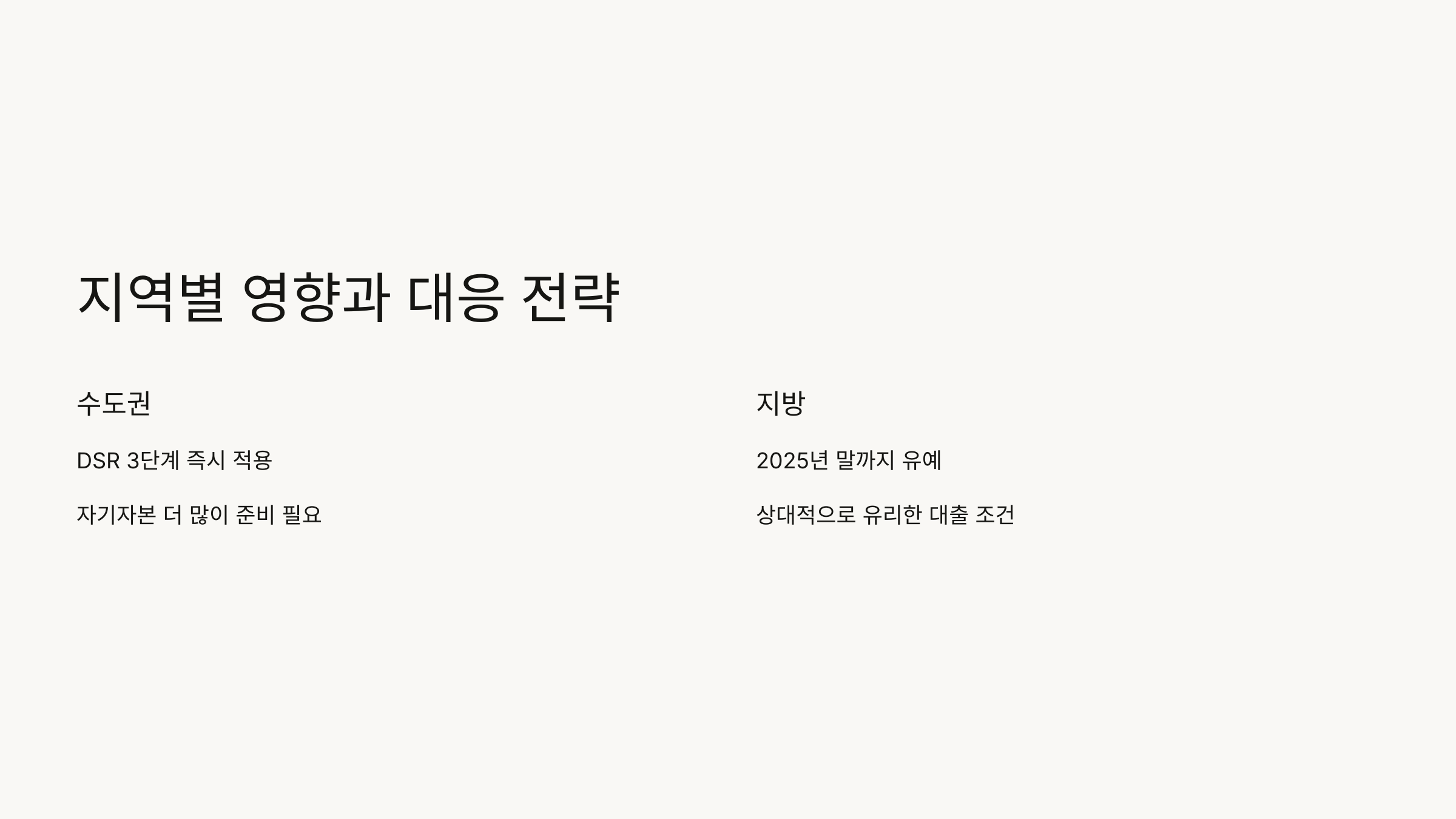 수도권 외 지역은 2025년 말까지 스트레스 DSR 3단계가 유예되어, 기존의 0.75%p만 추가됩니다. 따라서 지방 거주자는 상대적으로 유리한 조건에서 대출을 받을 수 있습니다.