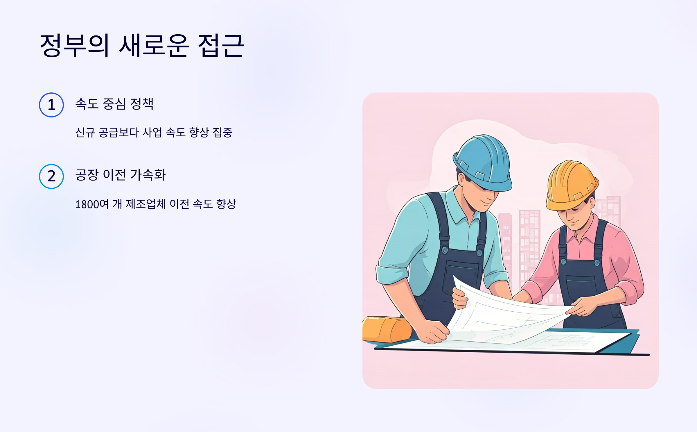 윤석열 정부 당시 발표된 용적률 상향 및 주택 용지 확대 정책은 기존 계획보다 5만 가구를 추가 공급하겠다는 목표를 세웠습니다. 하지만 이제는 새로운 공급 확대 정책보다는 사업 속도를 높이기 위한 해법을 마련하는 데 집중하고 있습니다. 특히 3기 신도시 내 1800여 개의 공장과 제조업체의 이전 속도를 높이는 방안에 초점을 맞추고 있습니다.