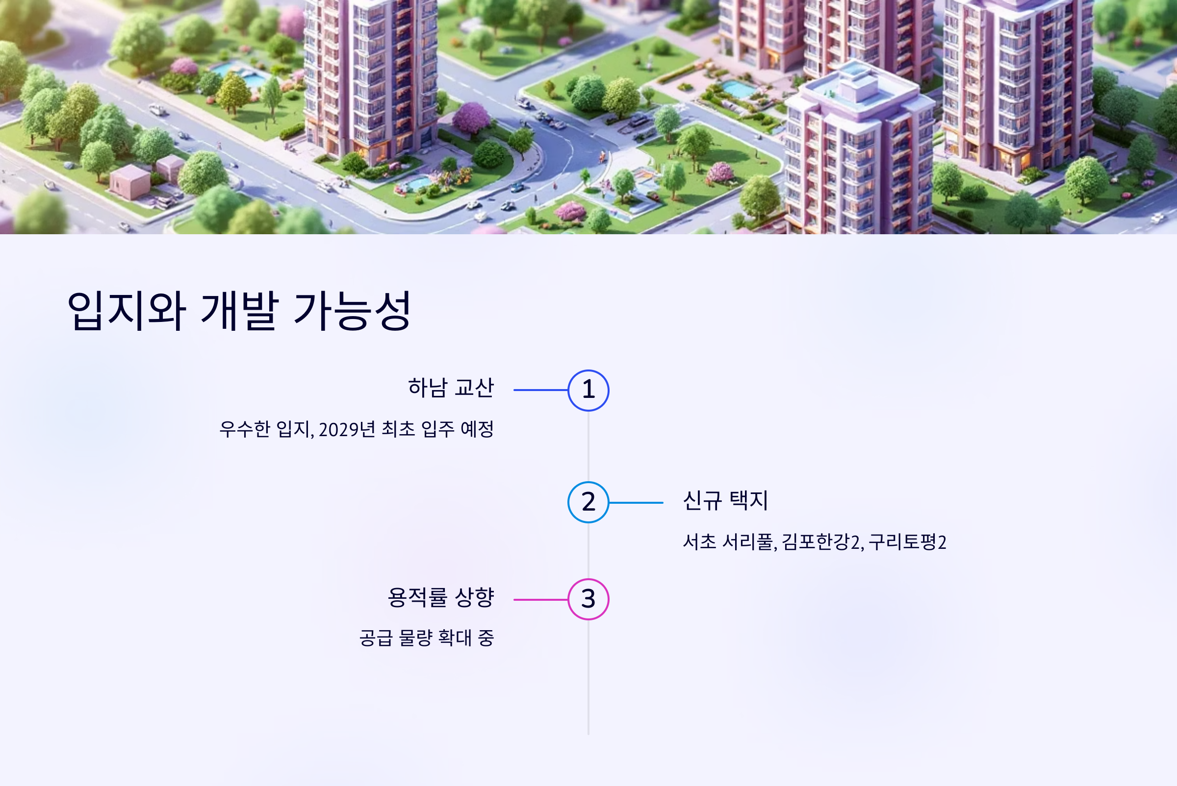 하남 교산은 우수한 입지로 주목받고 있으며, 2019년 공공주택지구로 지정되었지만, 최초 입주 예정일은 2029년으로 잡혀 있습니다. 이는 정부가 추진 중인 다양한 해법이 얼마나 효과적으로 적용될지에 대한 시험대가 될 것입니다. 또한 서초 서리풀, 김포한강2, 구리토평2와 같은 신규 택지에서 용적률 상향을 통한 공급 물량 확대가 관측되고 있습니다.