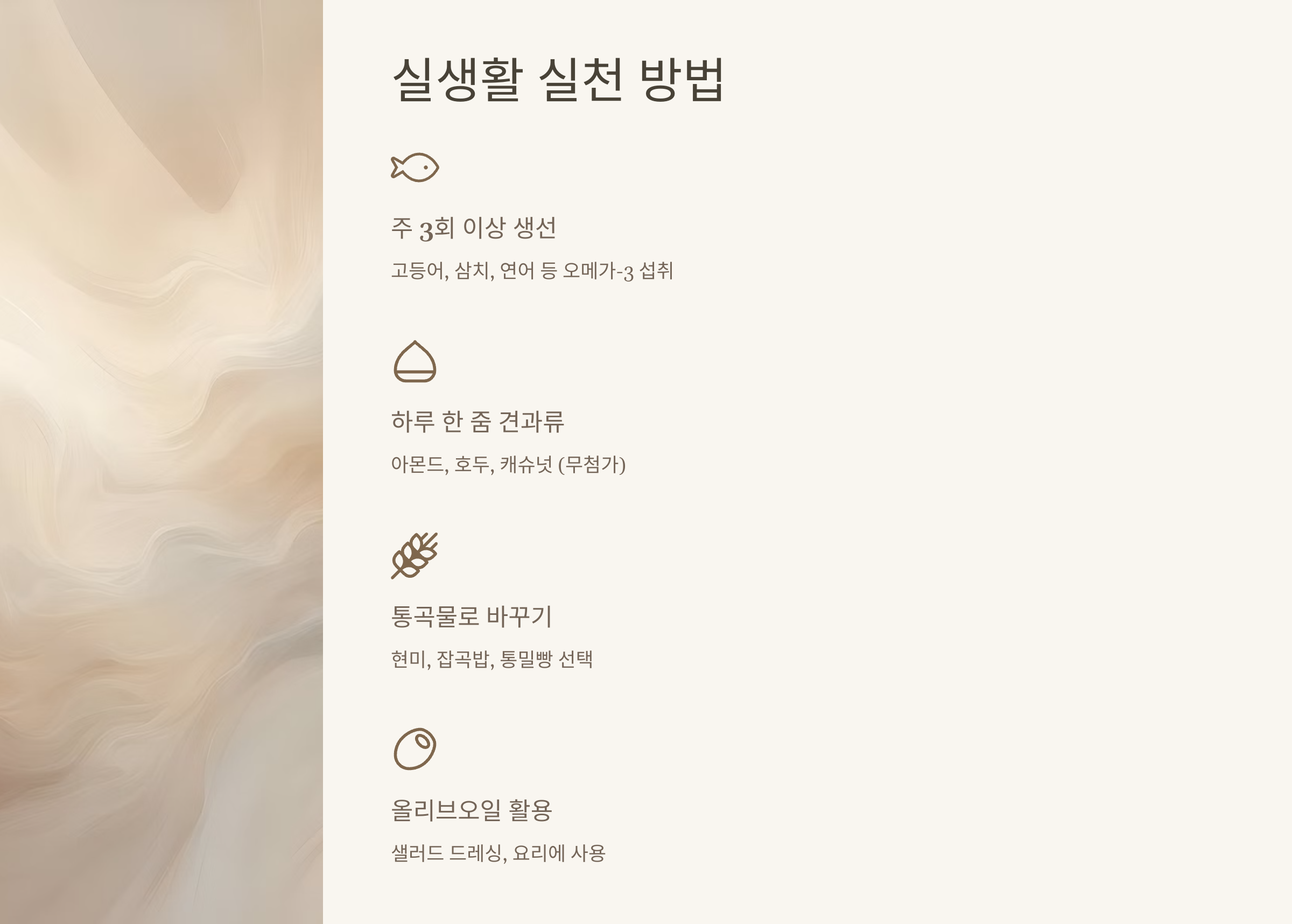 - 건강한 지방: 올리브오일 등 불포화지방 위주
