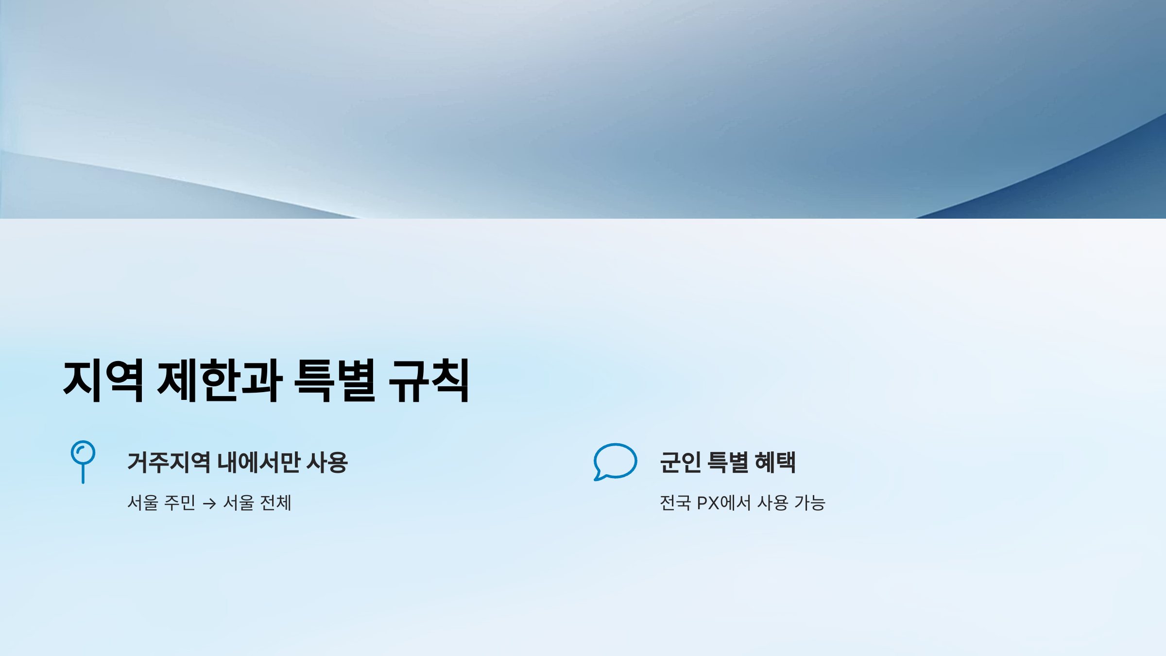 - 서울 주민: 서울 전체 사용 가능 (송파구 → 강남구 OK, 송파구 → 경기 하남 NO)