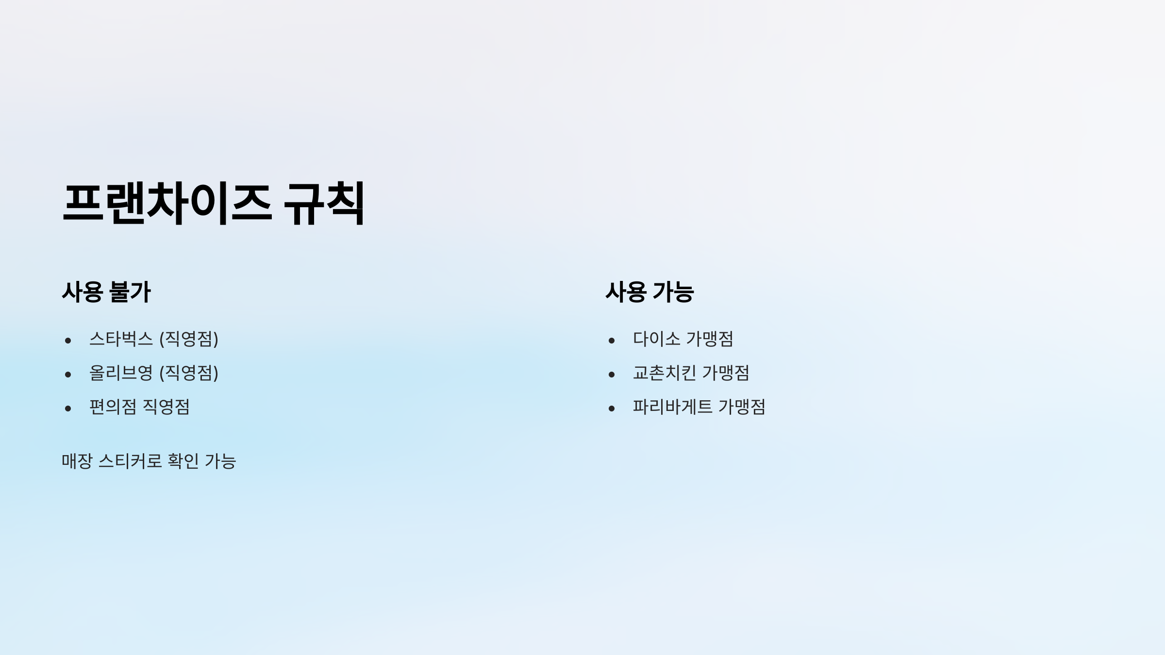 프랜차이즈 업계에서 가장 헷갈리는 부분이 바로 직영점과 가맹점 구분입니다. 같은 브랜드라도 운영 방식에 따라 사용 가능 여부가 달라집니다.