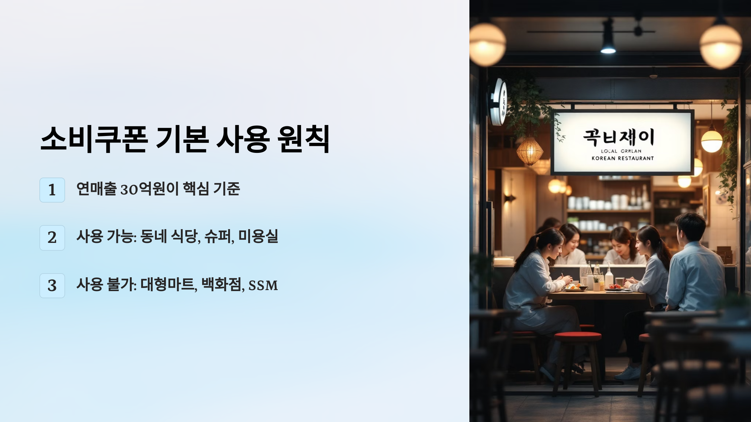 소비쿠폰 사용처를 결정하는 가장 중요한 기준은 바로 연매출 30억원입니다. 정부는 소상공인을 지원하기 위해 이 기준을 설정했는데, 쉽게 말하면 작은 가게는 되고 큰 업체는 안 된다는 의미입니다.