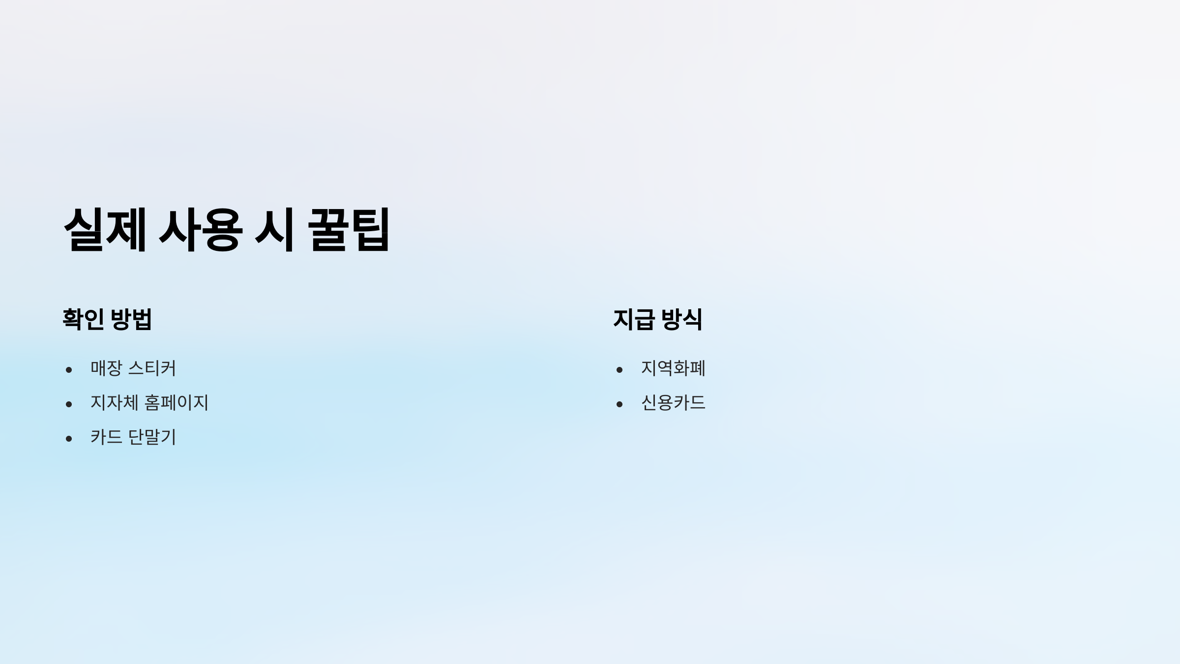 - 지역화폐 방식: 기존 지역사랑상품권 가맹점에서 사용