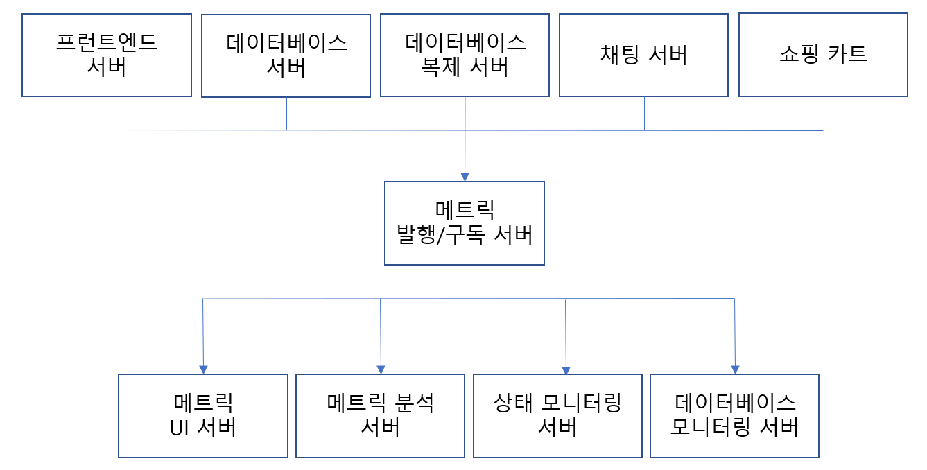 이 아키텍처를 개선한게 모든 애플리케이션의 메트릭을 하나의 애플리케이션이 수신하게 하고, 하나의 서버로 제공하면 해당 메트릭이 필요한 어떤 시스템에서도 쉽게 조회할 수 있다. 아래의 이미지가 이상적인 메시지 발행/구독 시스템이다.